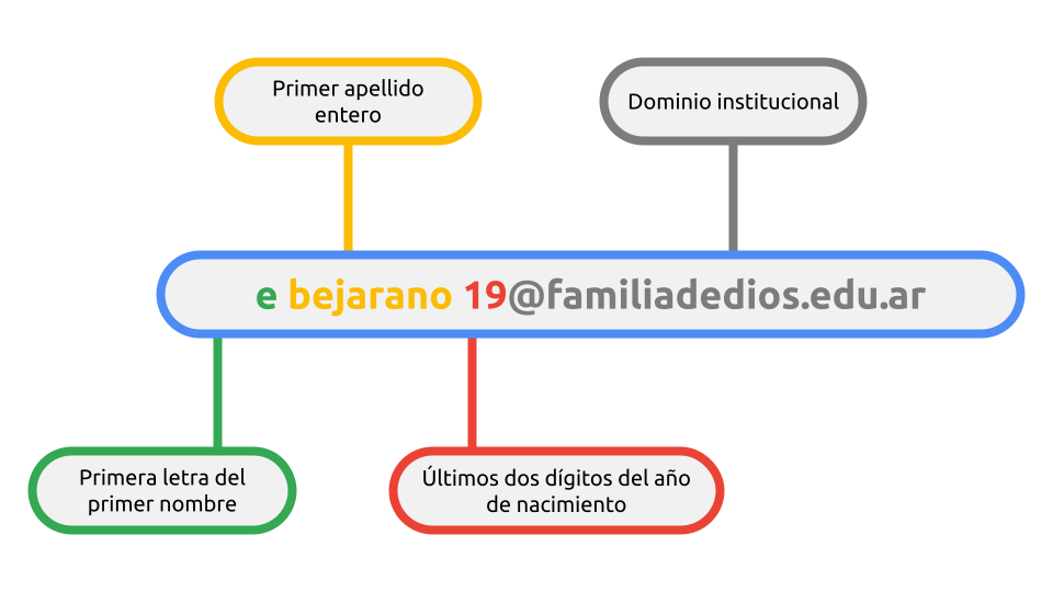 Cada estudiante cuenta con una cuenta institucional @familiadedios.edu.ar, que lo identifica de manera única en los entornos virtuales de nuestra institución. A través de ella, los alumnos pueden: